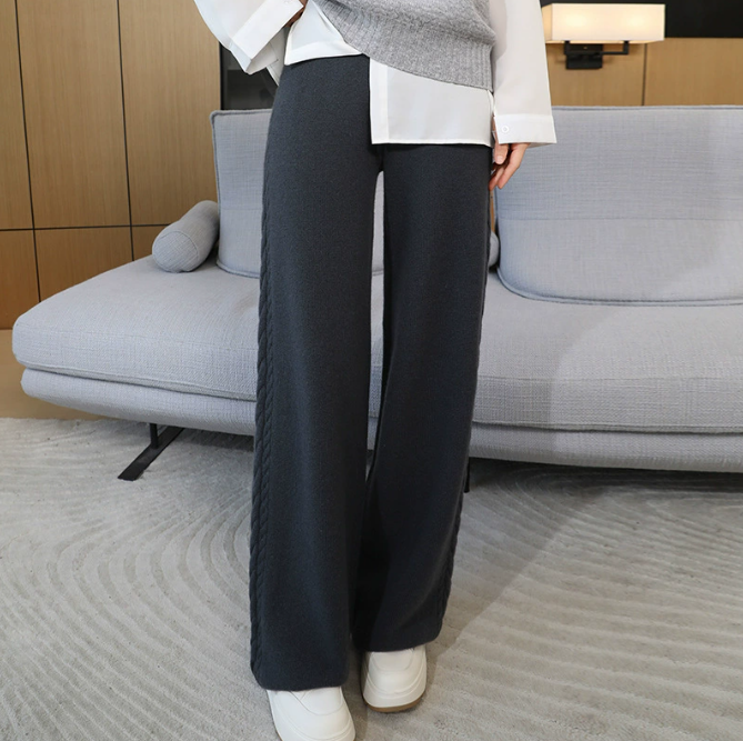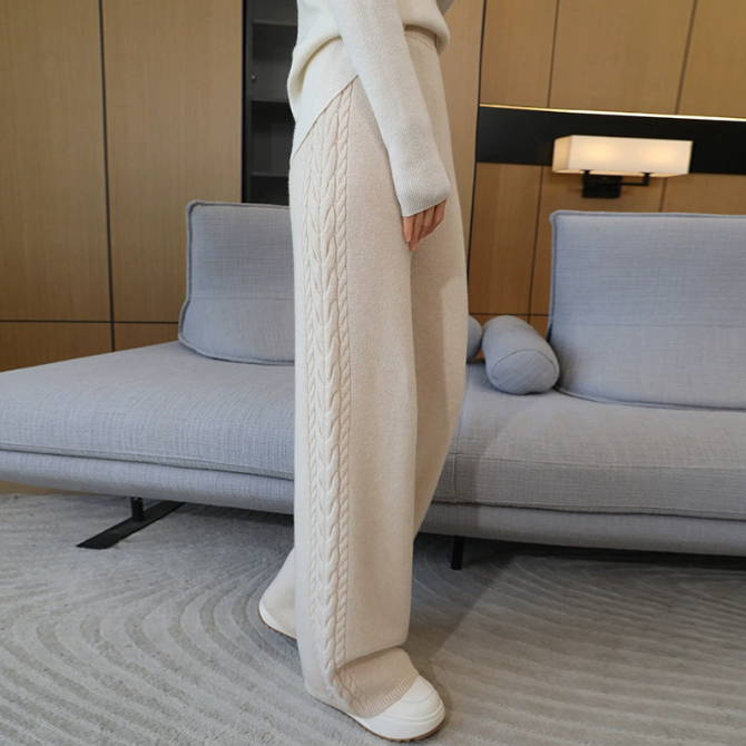 Gefertigt aus erstklassiger australischer Wolle bietet diese Hose natürliche Wärmeisolierung bei optimaler Atmungsaktivität. Die weiche, luxuriöse Textur spiegelt handwerkliche Qualität wider. Der gerade, weite Schnitt schmeichelt jeder Silhouette, während seitliche Zopfmuster eine dezente, elegante Note verleihen. Jede Größe ist auf die Körpergröße abgestimmt, um eine harmonische Länge und perfekten Sitz zu gewährleisten. In sechs edlen, vielseitigen Farben erhältlich – leicht kombinierbar mit Pullovern, Blusen oder Mänteln.
